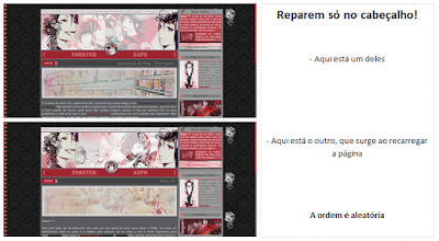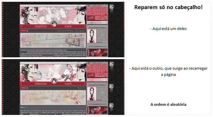 Ohayou! Não, não abandonei este blog, nem nada do género. Mas como não me apetece perder tempo com desculpas, vou diretamente à explicação desta postagem. No meu layout atual, e num free que disponilizei há algum tempo, recorri a um tutorial exclusivo meu que permite ter um blog com vários cabeçalhos. Não em simultâneo, claro, mas eles mudam (sendo a ordem aleatória) sempre que se recarrega a página. É muito simples, só se trabalha com gadgets e com urls, e o número de cabeçalhos que podem colocar não tem limites. Cliquem em ler mais para ver a prévia :)