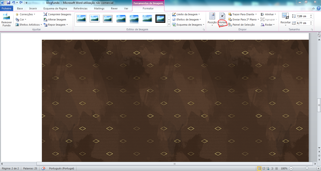 1º Abra o Word e, se quiser um cabeçalho largo, aumenta a largura da página nos números no canto direito em baixo. Pegue na imagem do fundo - basta *copiar e colar* - e monte o fundo até que tenha largura suficiente, não alargando a imagem porque ficaria desfocado, mas colando várias vezes uma ao lado da outra. Para a imagem poder ser arrastada/deslocada, clique duas vezes nela para a parte de cima do Word mudar e ir parar a *ferramentas da imagem*. Clique em *Moldar texto* (eu circulei a vermelho na imagem abaixo) e clique em *atrás do texto*.