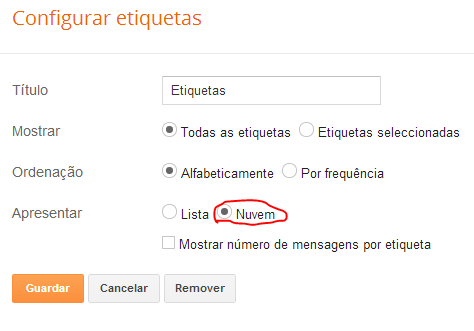Para usar, basta adicionar um gadget de "Etiquetas", e coloque-as em formato de nuvem, assim: